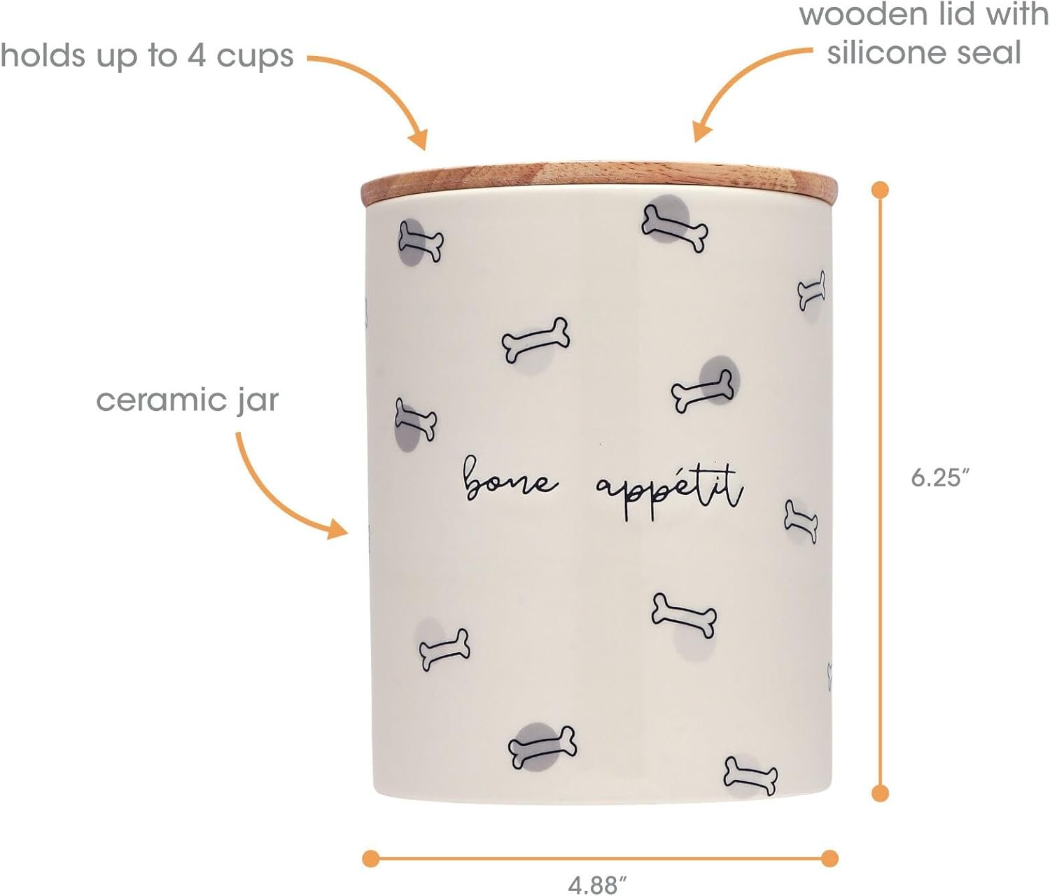 The dog treat jar from Pearhead stands out thanks to its chic ceramic design, neutral colorway, and bone-themed motif, all paired with reliable freshness thanks to the silicone-sealed wood lid.