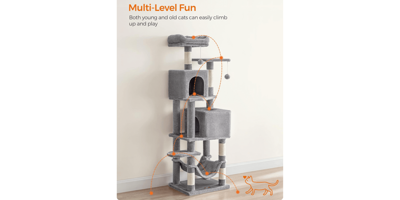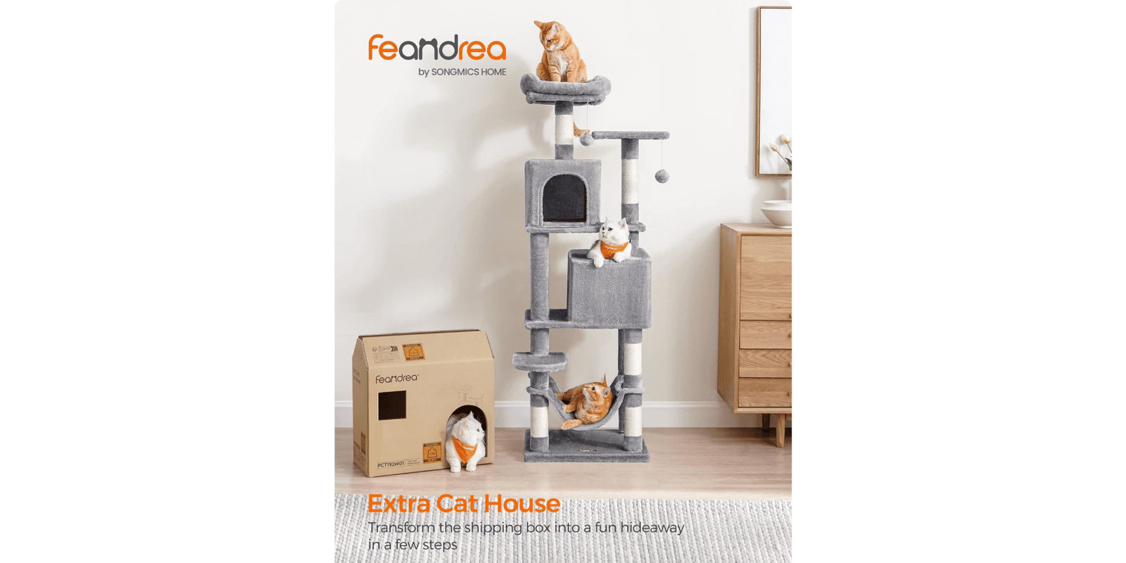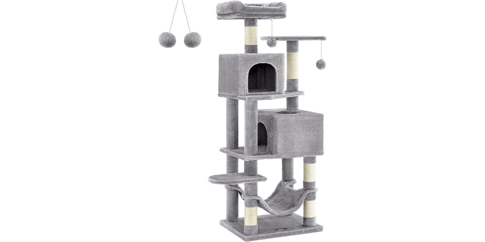The Feandrea 61-Inch Cat Tree is a multi-level cat condo designed to keep your indoor cats active and entertained. It features two cozy perches, two spacious caves, a hammock, and five sisal-covered scratching posts for climbing, scratching, and lounging. Made with sturdy construction and soft plush materials, this cat tower ensures both safety and comfort perfect for multi-cat households. Give your cats the ultimate play and relaxation space today!