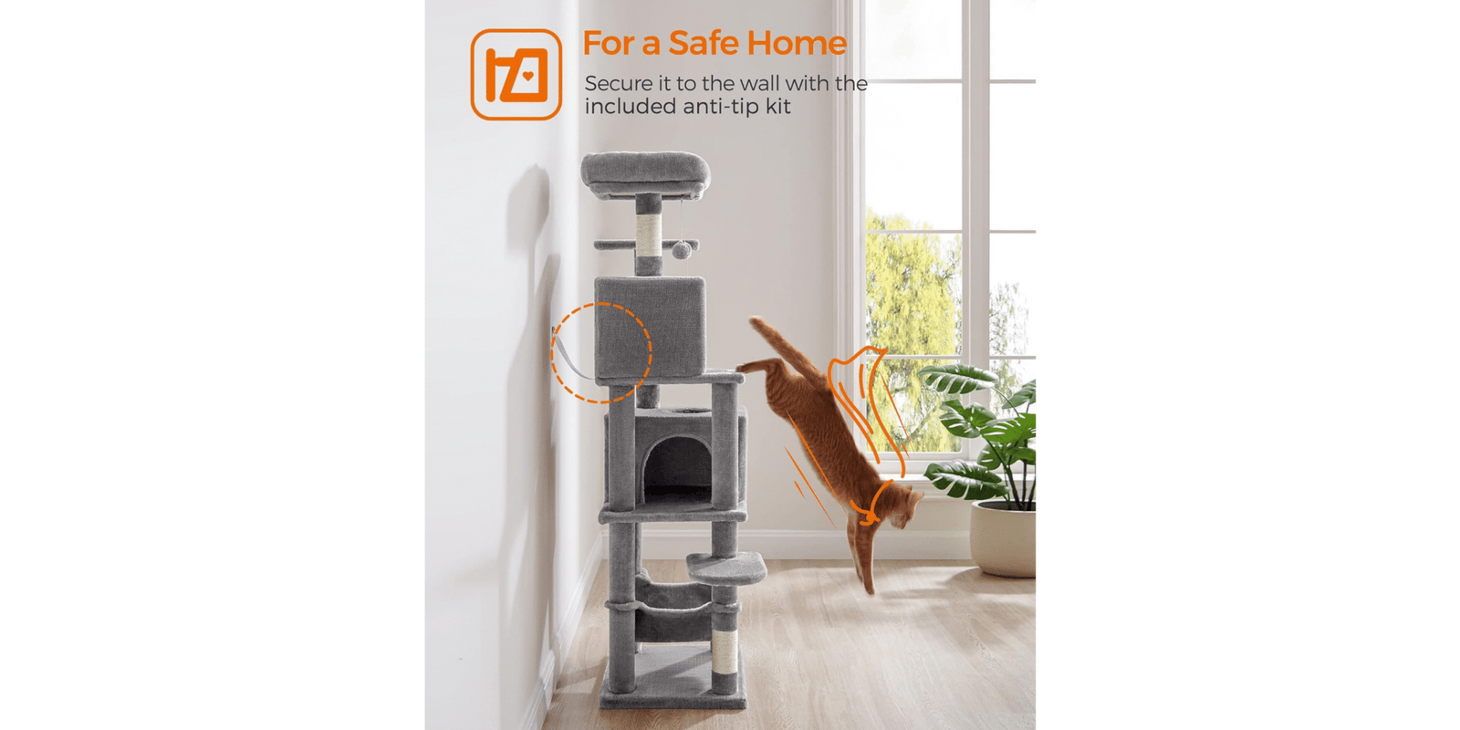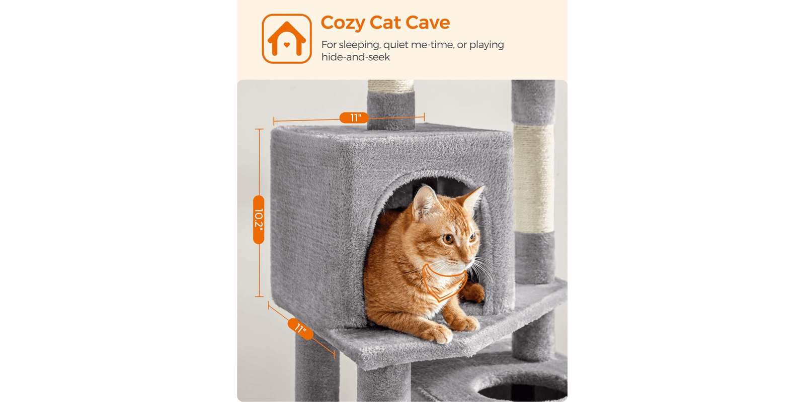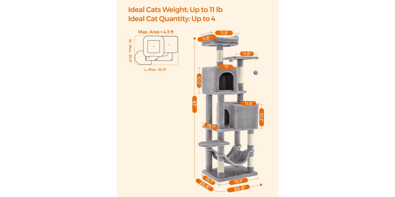 The Feandrea 61-Inch Cat Tree is a multi-level cat condo designed to keep your indoor cats active and entertained. It features two cozy perches, two spacious caves, a hammock, and five sisal-covered scratching posts for climbing, scratching, and lounging. Made with sturdy construction and soft plush materials, this cat tower ensures both safety and comfort perfect for multi-cat households. Give your cats the ultimate play and relaxation space today!